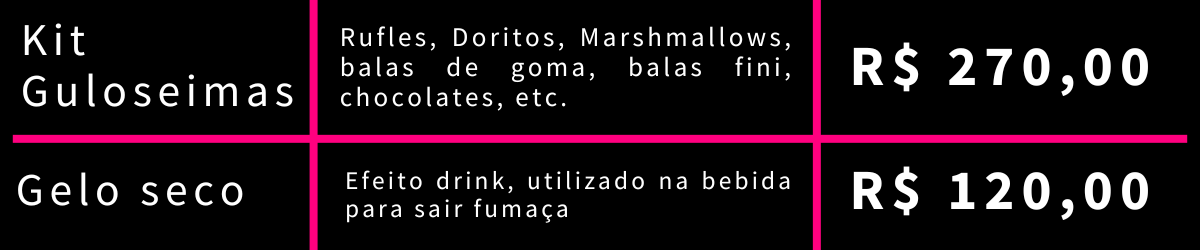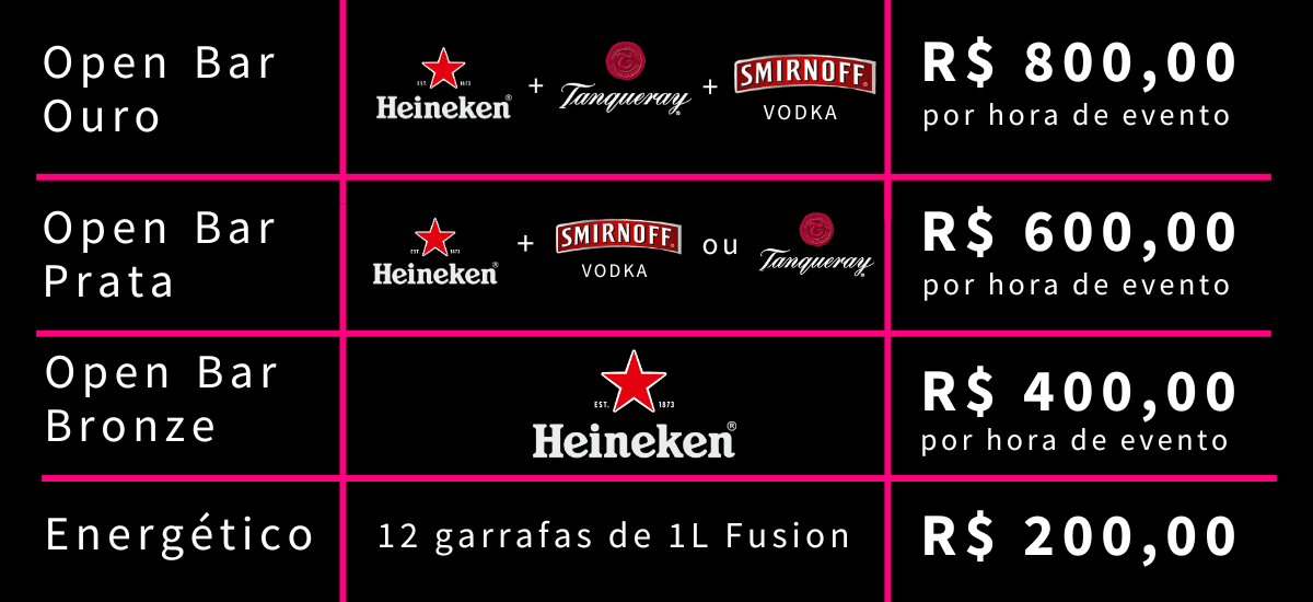 Nos nossos pacotes oferecidos estão inclusos refrigerantes, sucos (sabores variados), água e gelo, liberados durante todo o evento.